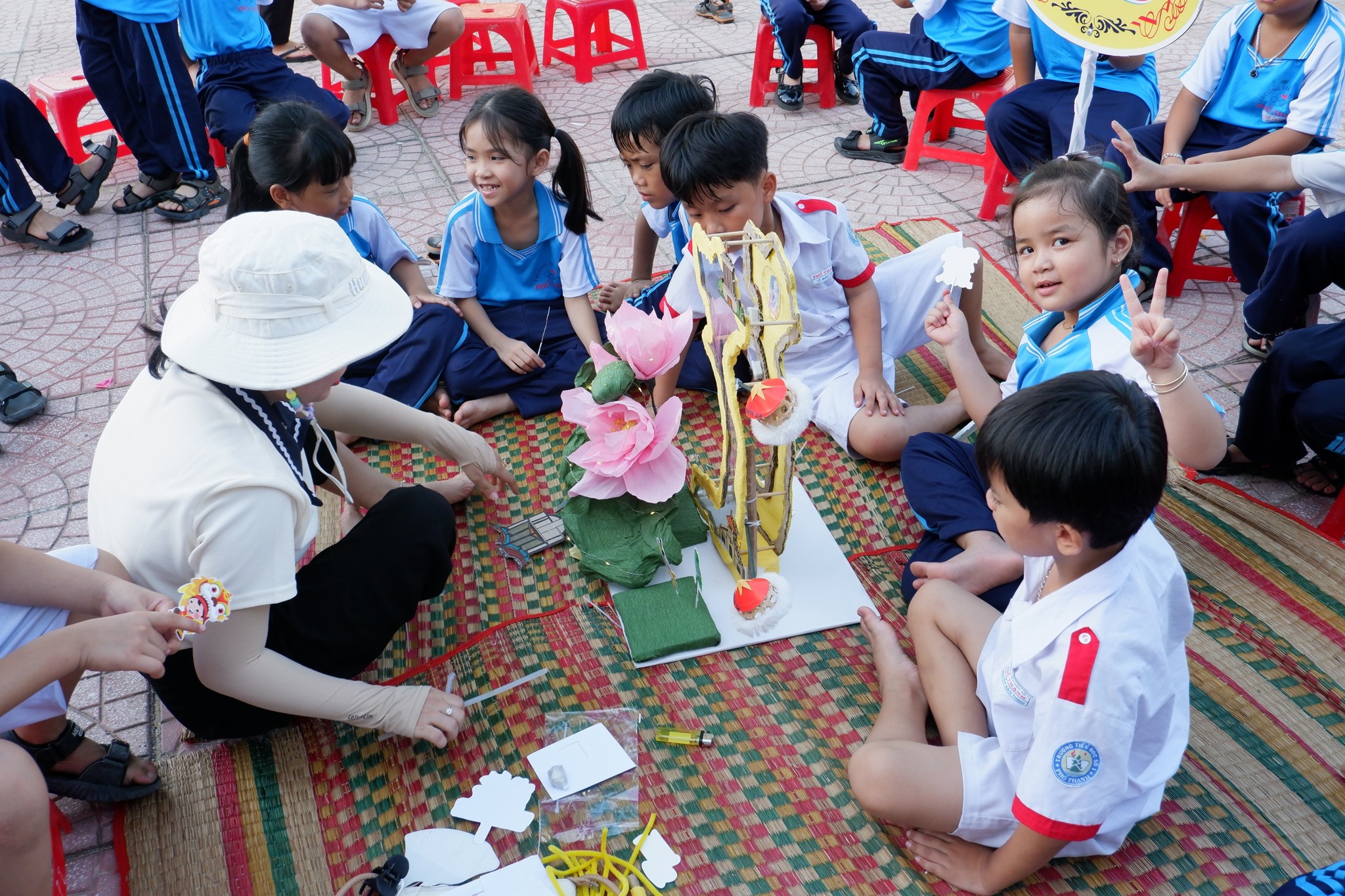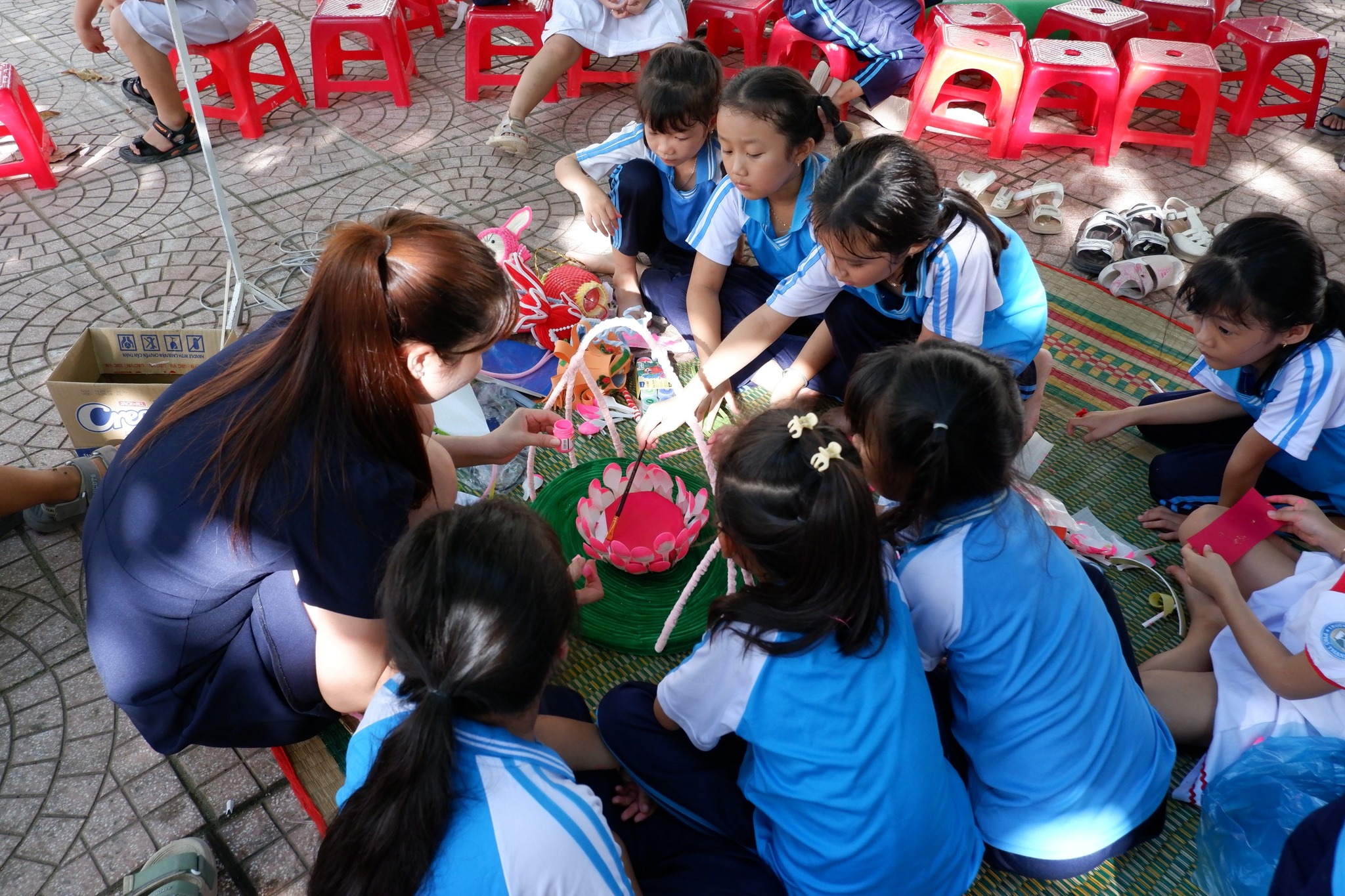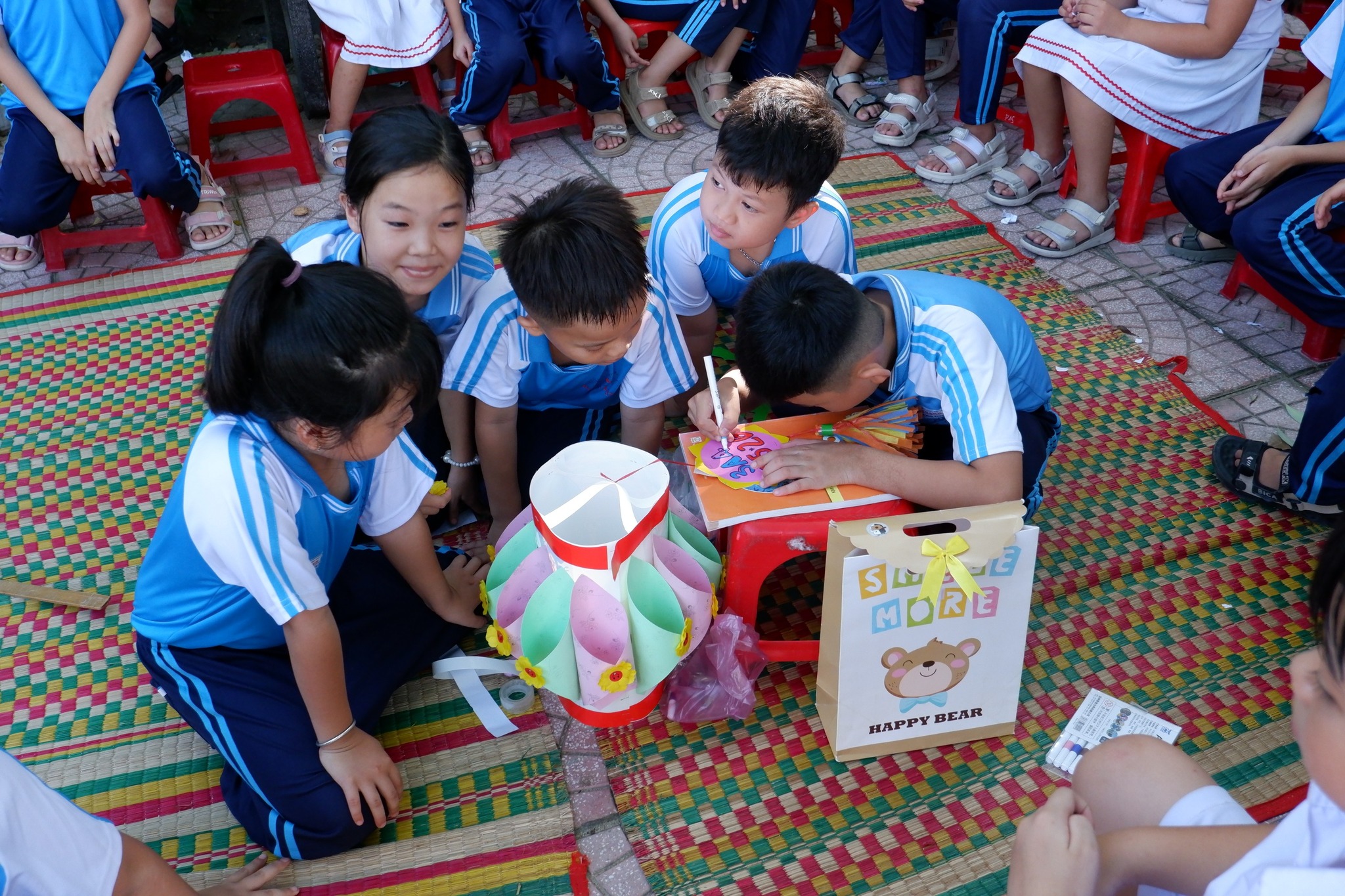 Các em học sinh hào hứng thi làm lồng đèn, khéo léo tạo nên những chiếc đèn xinh xắn, lung linh tỏa sáng khắp sân trường.