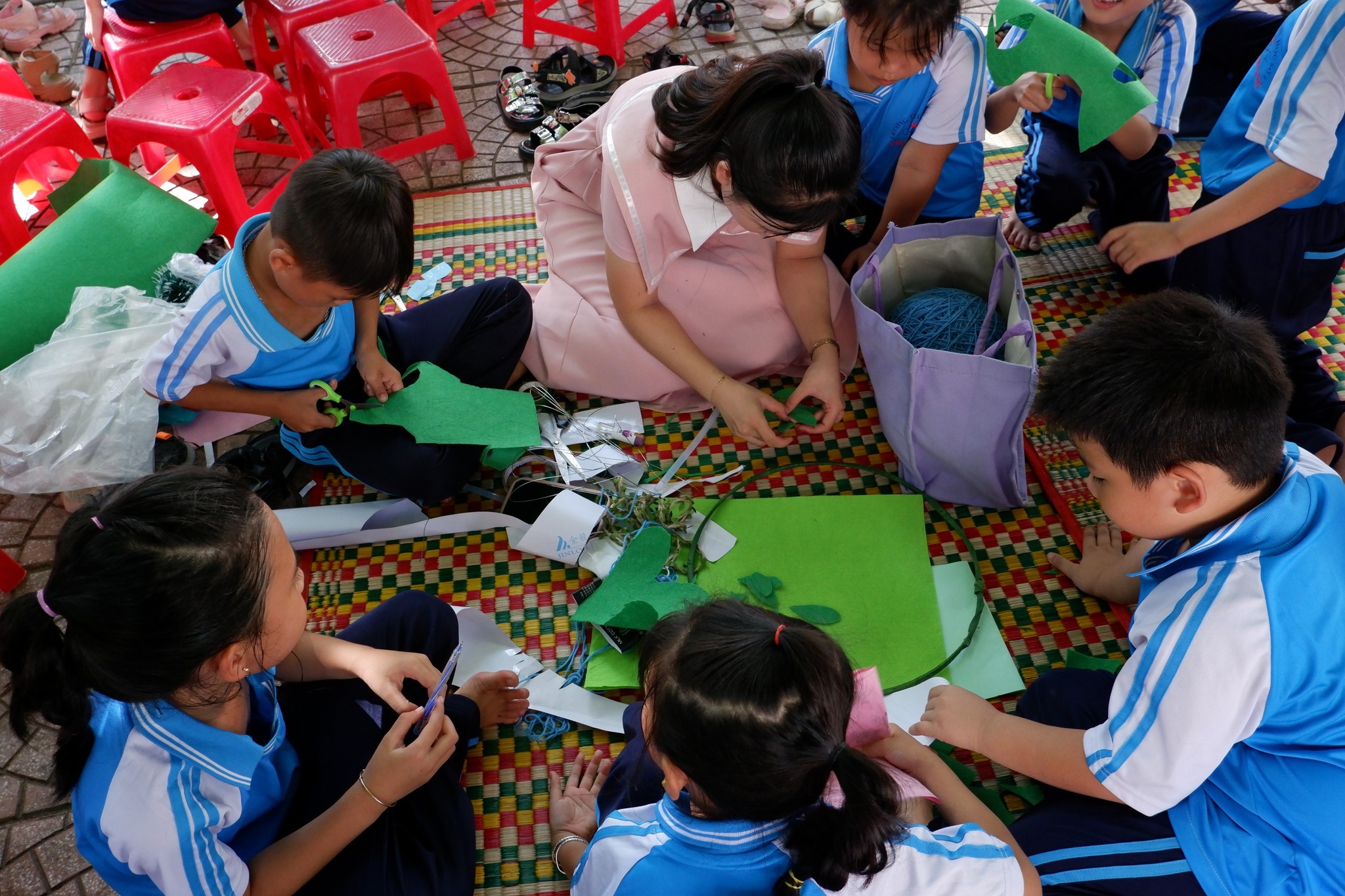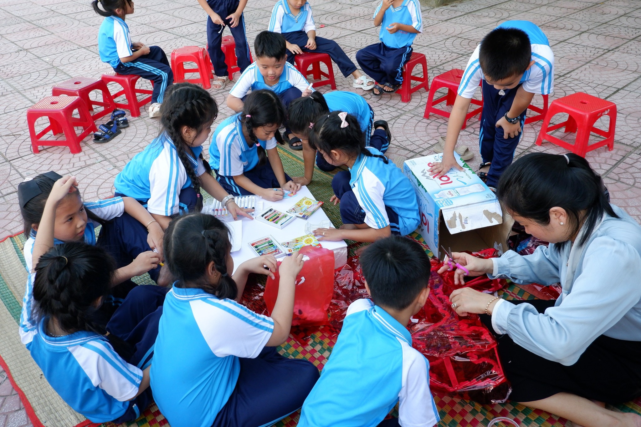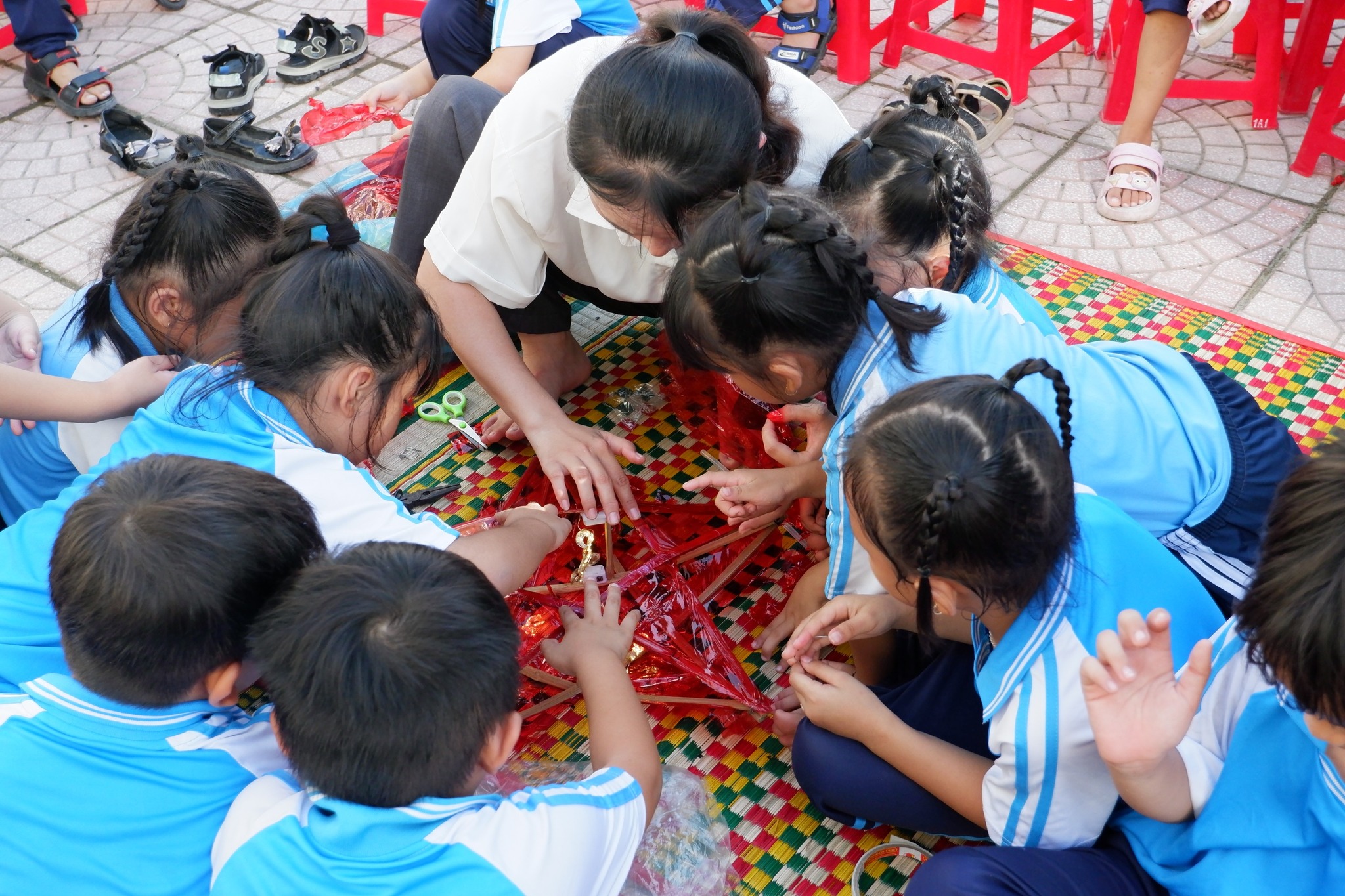 Các em học sinh hào hứng thi làm lồng đèn, khéo léo tạo nên những chiếc đèn xinh xắn, lung linh tỏa sáng khắp sân trường.